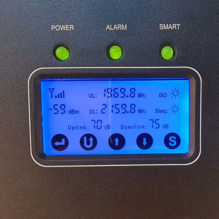En LCD display visar signalstyrka (in), uteffekt, förstärkningsfaktor både i uplink och downlink samt centerfrekvenser.
