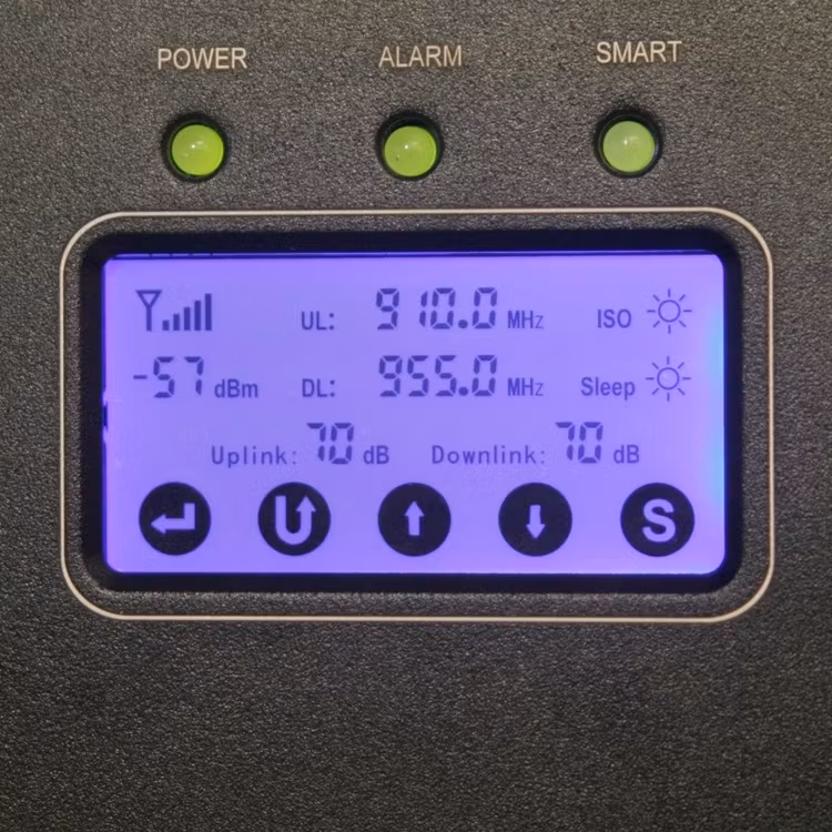 En LCD display visar signalstyrka (in), uteffekt, förstärkningsfaktor både i uplink och downlink samt centerfrekvenser.